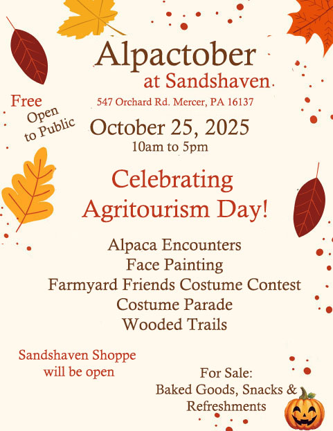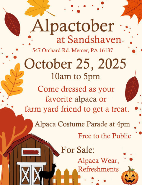 * Click for more information about National Alpaca Farm Days. * * Click for participating farms. * Shimmy Mob - Mercer, PA